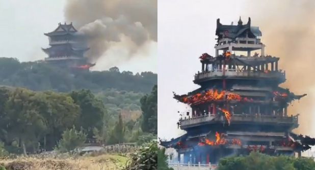China.- Un incendio de gran magnitud consumió el histórico pabellón Wenchang del milenario Templo Yongqing, en Zhangjiagang, provincia de Jiangsu, China.