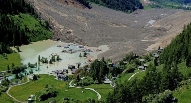 El deslizamiento, de una violencia devastadora, arrasó el 90 por ciento del casco urbano e implicó el desprendimiento de unos 3.5 millones de metros cúbicos de material que descendió la ladera a una gran velocidad, bloqueando además el curso del río Lonza, según informaciones transmitidas desde el lugar por la televisión pública suiza RTS.