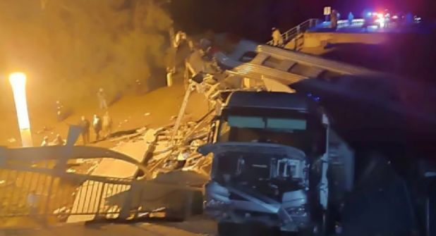 El hecho ocurrió el sábado en la noche, cuando se derrumbó un puente construido encima de la línea de un ferrocarril en momentos en que lo cruzaba un camión.