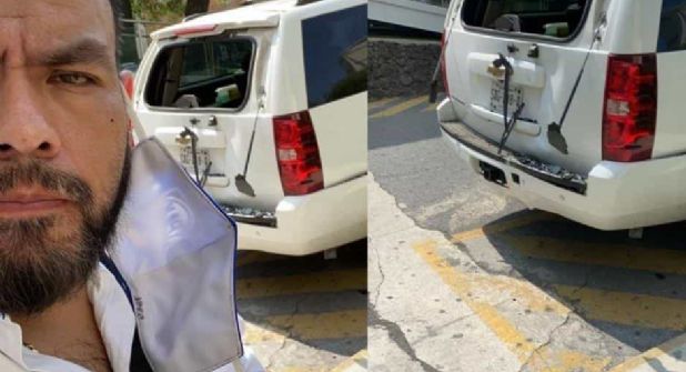En una fotografía que compartió se observa el golpe de su camioneta ocurrido en el estacionamiento del Hospital Christus Muguerza Conchita, ubicado en la colonia María Luisa, en el municipio de Monterrey.