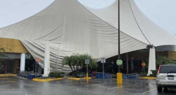 Monterrey.- Las fuertes lluvias y los vientos que se han dejado sentir en la zona metrópoli de Monterrey por la Tormenta Tropical Hanna hicieron que el techo de lona que da el acceso de un centro comercial colapsara en Monterrey.