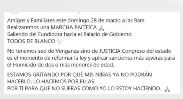Monterrey.- Mañana domingo 28 de marzo se realizará en Monterrey una marcha pacífica donde se honrará a las dos niñas que el lunes 22 de marzo perdieron la vida en un accidente automovilístico en el municipio de San Nicolás.