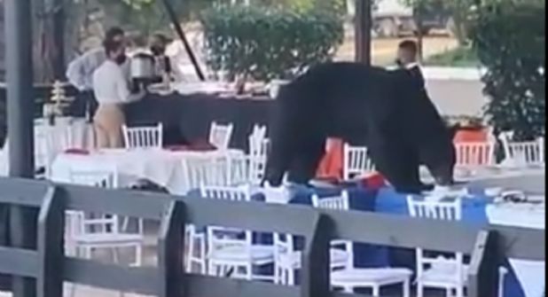 SAN PEDRO GARZA.- Un grupo de personas estaban desayunando en el Hotel Chipinque de San Pedro Garza García cuando de pronto un oso se hizo presente para comer con ellos.