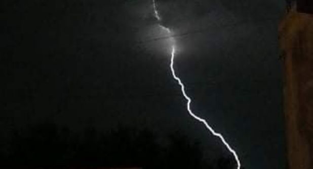 La fotografía muestra el momento en que un rayo cae desde las nubes hacia el suelo, aunque no se aprecia el lugar del impacto.