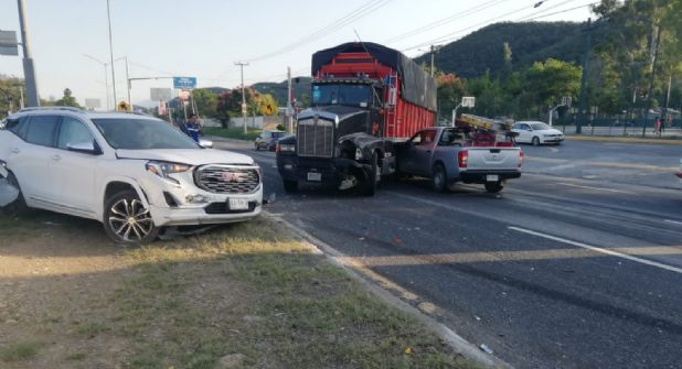 Monterrey. - Cuerpos de auxilio recibieron el reporte la tarde de este jueves de un choque donde participó un camión y dos camionetas en la Colonia Los Cristales sobre la Carretera Nacional.