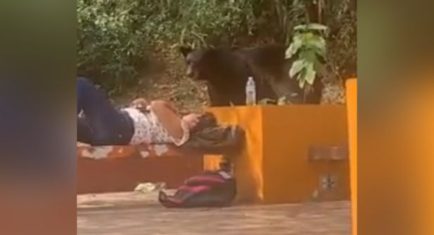 En el clip se aprecia a un oso de gran tamaño saliendo entre la maleza y acercándose cuidadosamente al punto donde se encontraba esta joven acostada en una de las bancas de esta pequeña explanada.