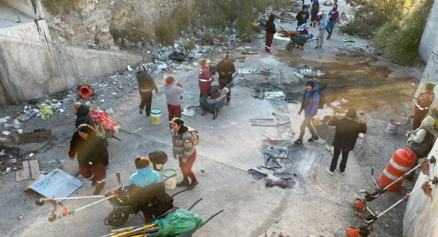 En el punto, ubicado en el cruce de avenida San Martín de Porras y San Benito de Aniane, en la colonia Praderas de San Francisco, donde no hay barandales que contengan riesgos ante el desnivel entre la avenida y arroyo, 25 trabajadores se dieron cita para labores de limpieza.