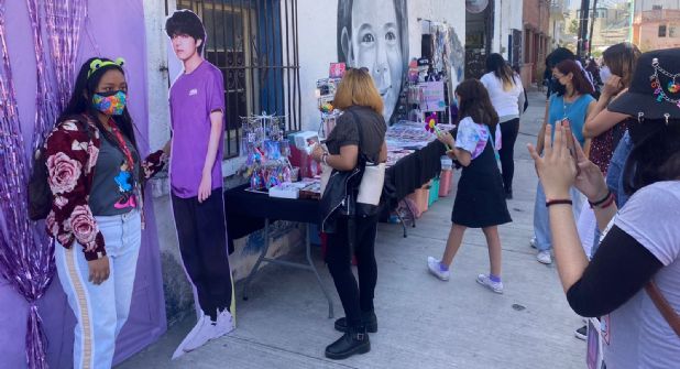 También, sobre la pared donde lucen los rostros de la agrupación, integrantes del club ‘Love Bts Monterrey’ organizaron un mercadito ofertando distintos accesorios y recuerdos de la agrupación.