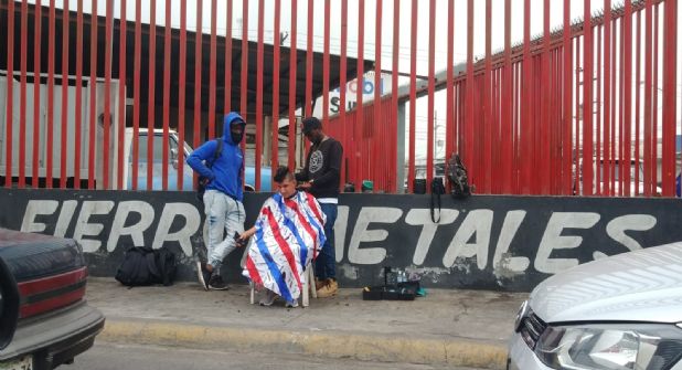 Equipados con tijeras, rasuradoras, capa y una silla de jardín que sirve para atender a sus clientes, jóvenes haitianos improvisaron una barbería en una acera de la calle Luis Mora, justo frente a la casa INDI, para dar el servicio a otros migrantes y poder mejorar un poco su economía.