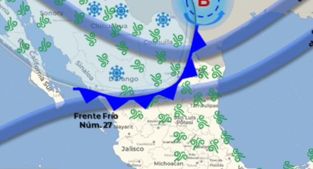 Monterrey.- El ingreso del nuevo frente frío número 27 de la temporada originará vientos de fuertes a intensos, así como un descenso en la temperatura del noroeste y norte de México, informó la Comisión Nacional del Agua (Conagua).