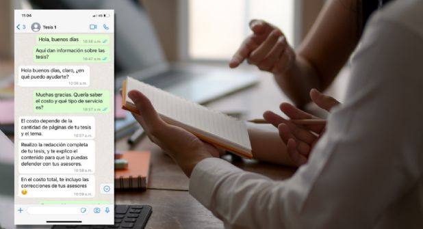 “Realizo la redacción completa de tu tesis, y te explico el contenido para que puedas defenderlo con tus asesores. En el costo total te incluyo las correcciones y los envíos te los hago por correo electrónico”, escribió un vendedor a través de WhatsApp.