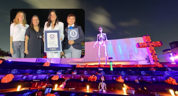 “Por mencionar algunos de esos elementos, sal, agua, incienso, dulces, pan, flores, la figura importante del xoloitzcuintle, entre otros elementos, el área a superar según el último récord establecido es de mil 44 punto 30 metros cuadrados hoy en Guinness World Records es un placer para mi certificar que el número final de este altar de Día de Muertos es de mil 212 punto 40 metros”, dijo Reyes.
