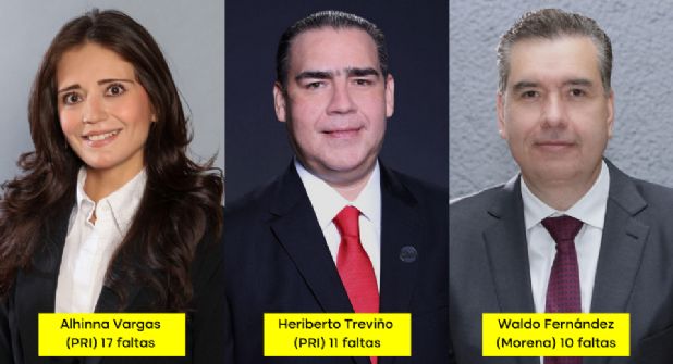 La lista la encabeza Alhinna Vargas con 17 faltas, y aunque la priista renunció el 15 de septiembre a su cargo, su nombre sigue activo porque no le han aprobado la separación del cargo y acumula otras 15 faltas para dar un total de 32.