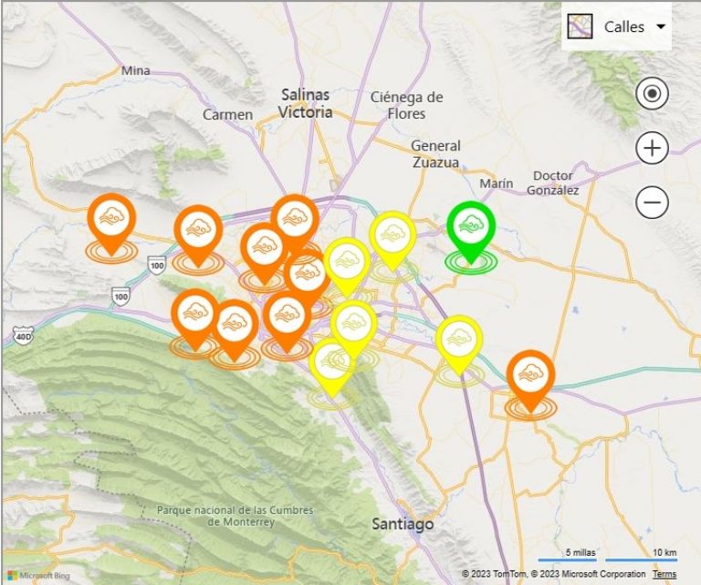 De las 15 estaciones, nueve marcan color naranja, mientras que cinco marcan amarillo, el cual es aceptable y solamente una se pinta de verde, lo cual quiere decir que el aire es muy bueno, y el riesgo es bajo, así lo demuestra el mapa donde se dibujan las herramientas virtuales de la Secretaría de Medio Ambiente de Nuevo León.