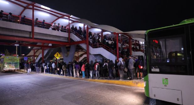 Guadalupe.- Usuarios del transporte público en el municipio de Guadalupe enfrentan desafíos para abordar camiones en el centro de transferencia de la estación del metro Exposición, donde las personas esperan hasta dos horas, pasando frío o resguardándose de la lluvia.