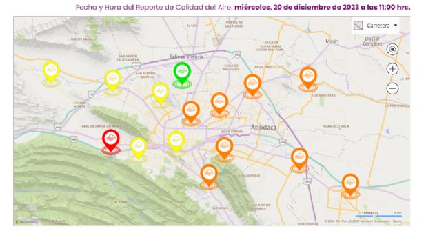 Los dos marcadores de García se encontraron en color amarillo; es decir, una calidad del aire moderada o aceptable, al igual que en San Pedro y las estaciones del noreste y sur de Monterrey, mientras que en Escobedo se mantuvo en color verde con buena calidad.