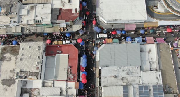 A través de una fotografía aérea, en el cruce de las calles Garibaldi y 15 de Mayo, era posible observar techos sobresalientes de los negocios tapando las calles, mismos que la autoridad regia aseguró haber retirado en uno de los tres operativos realizados.