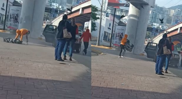 En las imágenes se observa que hay gente a su alrededor, sin embargo, estas sólo observan estupefactas las acciones de un hombre vestido con un suéter naranja y la gorra del mismo cubriendo su rostro.