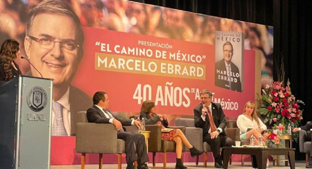 Durante la presentación de su libro “El Camino de México, 40 años de Amor por México”, en el Aula Magna del Colegio Civil, ubicada en el centro de Monterrey, el canciller fue recibido por simpatizantes al grito de “¡Presidente, Presidente!”.