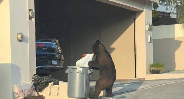 En un video compartido en redes sociales, se observa al oso merodeando la zona de la cochera y posteriormente sacando bolsas de basura del boto.