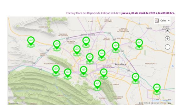 Lo anterior se dio a conocer a través de la página de calidad del aire del Gobierno de Nuevo León. En el mapa se muestran las 15 estaciones en color verde, es decir, que hay un buen índice en el aire y la salud.