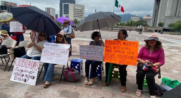 Monterrey.- Un grupo de maestras jubiladas y personal administrativo de la Sección 50 del SNTE realizó una protesta pacífica frente al Palacio de Gobierno de Nuevo León, para exigir mejoras en los servicios médicos del Isssteleón.