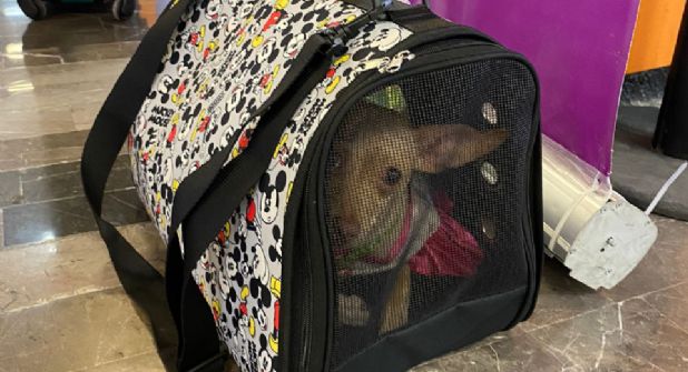 Con la fotografía, aeropuerto detalla que el perrito está adentro de una transportadora del personaje Mickey Mouse en la zona de documentación de Volaris.