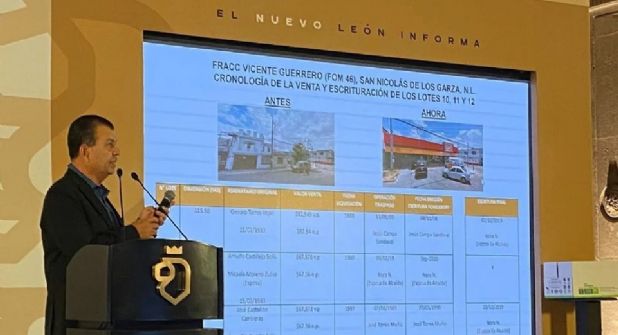 Anteriormente, el Secretario General de Gobierno, Javier Navarro, y el director de Fomento Metropolitano de Monterrey (Fomerrey), Eugenio Montiel, notificaron que denunciarán a Nora “N”, esposa del exalcalde de San Nicolás, por la presunta obtención irregular de tres lotes contiguos en la colonia Fomerrey 46 Vicente Guerrero.