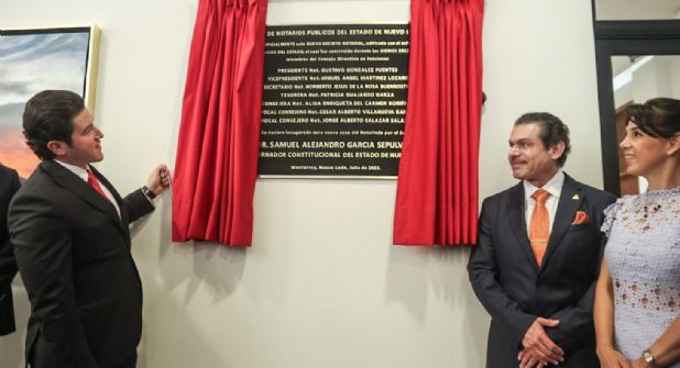 El gobernador Samuel García fue responsable de develar la placa inaugural del nuevo edificio del Colegio de Notarios Públicos de Nuevo León; posteriormente realizó un recorrido por las instalaciones acompañado del secretario general de Gobierno, Javier Navarro Velasco y del presidente del cuerpo colegiado, Gustavo González Fuentes.