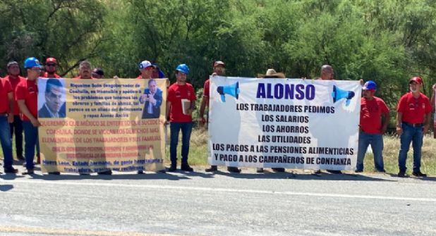 Asimismo, en otra lona mostraban una imagen del gobernador coahuilense Miguel Ángel Riquelme al señalar que se ha mostrado insensible ante la violación de derechos laborales en espera de ser atendidos por AMLO.