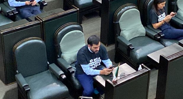 Mientras tanto, de la bancada del PRI únicamente se vio a la diputada Perla Villarreal con esta playera puesta, quien anteriormente aseguró ser víctima de persecución por el Ejecutivo y por MC para que renuncie, y que los diputados naranjas tengan una curul más a través de su suplente.