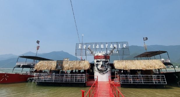 "El barco del Pirata" es uno de los tantos negocios que se encuentran en la Presa La Boca, la cual está sufriendo los estragos de la sequía en la entidad.