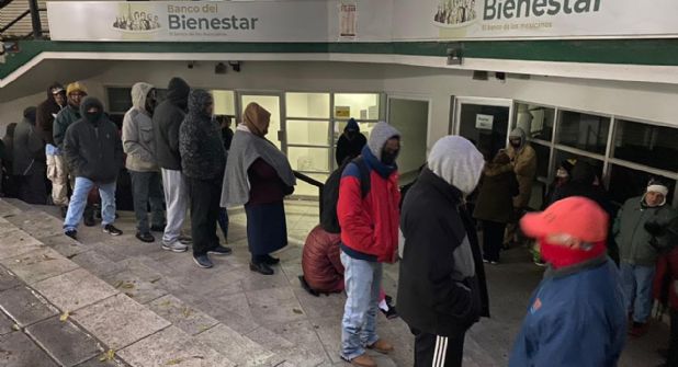 Monterrey. - Con temperaturas bajo cero, decenas de adultos mayores hicieron fila a la intemperie en las instalaciones del Banco del Bienestar para cobrar su pensión desde horas antes de su apertura a las 8:00 horas.