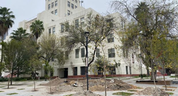 Monterrey.- El retiro de árboles secos en la Explanada Cultural del LABNL, a espaldas del Palacio de Gobierno, sigue sin realizarse.
