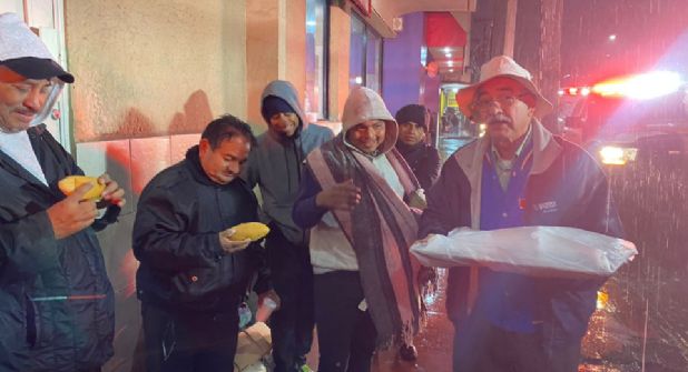 Monterrey.- Ante las bajas temperaturas y la presencia de lluvia, Protección civil de Monterrey implementó el Operativo Carrusel en diferentes puntos del primer cuadro de la ciudad para dar chocolate caliente y pan a las personas que están en situación vulnerable.
