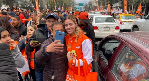 Monterrey.- Banderas, batucada, calcas y perritos fueron la postal de la Plaza Zaragoza en el cierre de precampaña de la precandidata Mariana Rodríguez Cantú a la alcaldía de la capital regia.