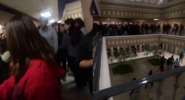 En el video grabado por un alumno del instituto, se ve cómo los estudiantes de los pisos superiores e inferiores evacuan el edificio, corriendo con caras de pánico y angustia, mientras la alarma de fondo insiste en la necesidad urgente de salir.