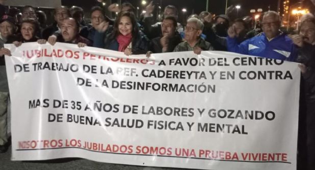 "Jubilados petroleros a favor del centro de trabajo de la Ref. Cadereyta y en contra de la desinformación. Más de 35 años de labores y gozando de buena salud física y mental. Nosotros, los jubilados, somos una prueba viviente", fue uno de los mensajes escritos en una de las pancartas de esta protesta.