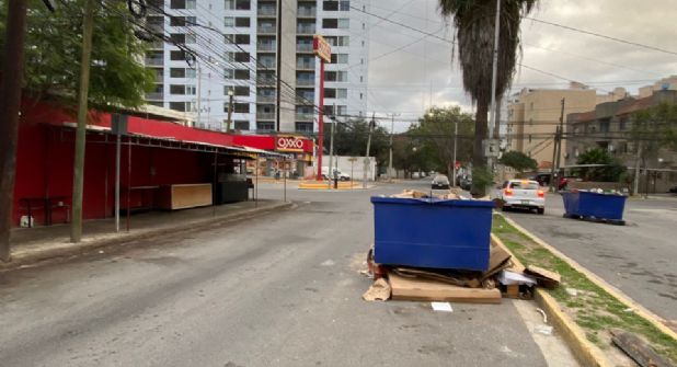 Asimismo, un segundo contenedor ocupa un espacio junto al camellón central de la misma calle, en este caso este bote está colocado sobre pedazos de cartón o basura que se quedó en el suelo tras el paso del camión.