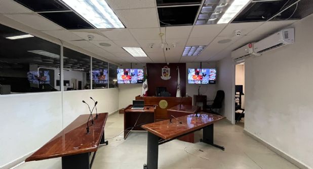 inmueble ubicado en la avenida Lázaro Cárdenas en la Zona de Valle Oriente, inundando tras registrarse el rompimiento de una tubería, afectando las paredes, techos, muebles y las salas de audiencias, por el agua que escurría como cascada.