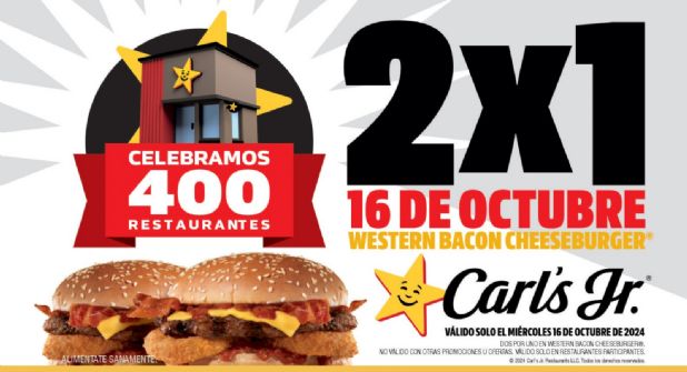 Monterrey.- La cadena de hamburguesas Carl´s Jr. está de fiesta, ¡Ya son 400 restaurantes en México! y ante esta gran celebración tiene una rica y jugosa promoción 2x1.