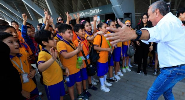 La reunión previa a la visita a la Feria del Libro se llevó a cabo en el Estadio BBVA, donde el edil convivió con los niños y les compartió su entusiasmo por la lectura y el deporte, a quienes invitó a presenciar los próximos partidos del equipo albiazul para que conozcan el recinto que será sede mundial de fútbol en el 2026.