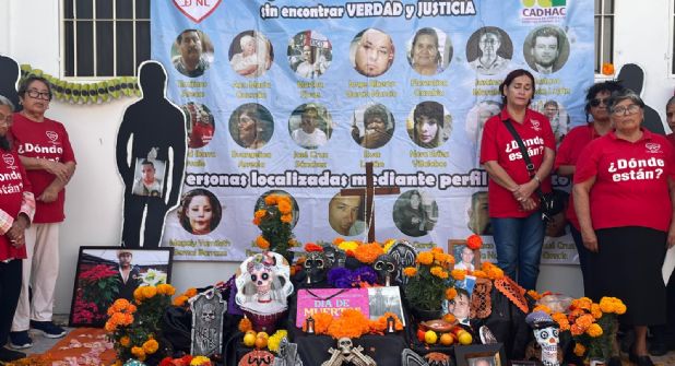 La ofrenda colocada al exterior de las instalaciones de Ciudadanos en Apoyo a los Derechos Humanos A.C., estaba formado por un camino de flores de cempasúchil que marca los pasos que andan dado en busca de sus seres queridos, fotografías con sus rostros, veladoras, fruta, una catrina gigante, su comida favorita, además de dedicarles algunas palabras, mientras de fondo se escuchaban melodías alusivas al Día de Muertos.