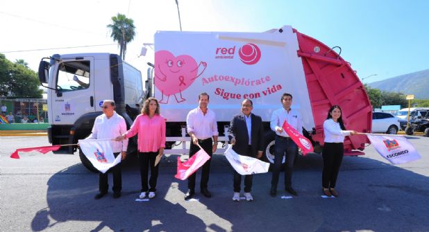 Autoridades de Red Ambiental y del Gobierno de Escobedo dieron banderazo de salida al camión de recolección domiciliaria que recorrerá 22 rutas del municipio difundiendo el mensaje “Autoexplórate, Sigue con vida”.