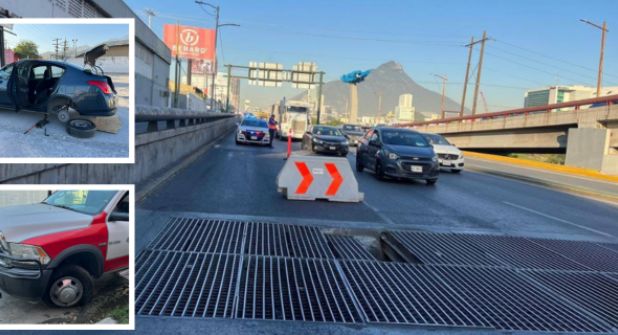 Monterrey. - Al menos 20 coches resultaron dañados en sus llantas y rines por caer en una rejilla abierta de alcantarillado.