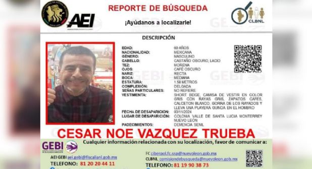Monterrey.- El pasado 3 de noviembre, Cesar Noé Vázquez Trueba, de 60 años, fue reportado como desaparecido en la colonia Valle de Santa Lucía, ubicada en el municipio de Monterrey, Nuevo León.