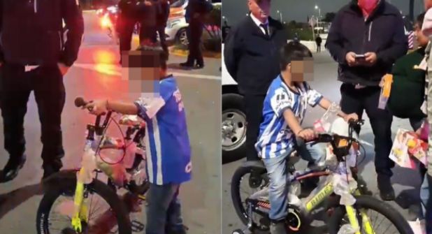 Guadalupe.- Por medio de colectas y cooperación entre los elementos de Policía y Tránsito de Guadalupe NL, sorprendieron con una bicicleta nueva a un niño que junto a sus papás vende dulces afuera del Estadio BBVA.