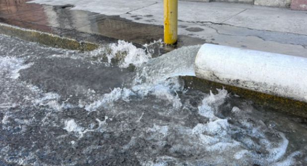 La construcción se ubica sobre la calle Matamoros, donde se puede ver la instalación de un tubo de PVC, de por lo menos ocho pulgadas de diámetro que de manera continua expulsa aguas sobre la vía pública afectando calles como General Francisco Naranjo y Florencio Antillón.