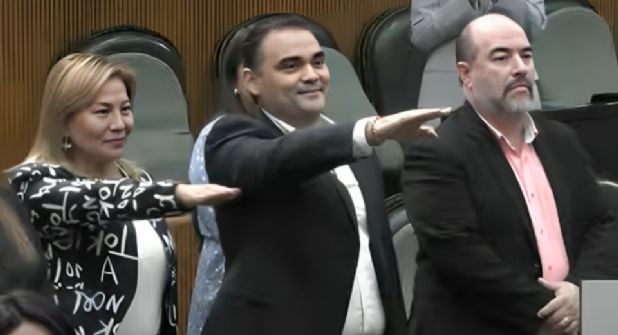 Antes de ingresar al pleno, la emecista se presentó junto al coordinador de la bancada sosteniendo una pancarta, en donde acusa que suma 166 días sin tomar protesta desde que el Tribunal Electoral del Estado lo ordenó por primera vez.