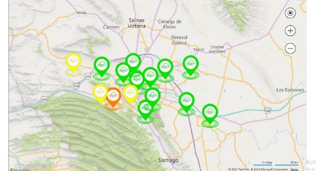 Las estaciones de monitoreo que registran “aceptable” (amarillo) se encuentran en los municipios de García (estación ubicada en el Ayuntamiento), Santa Catarina y Monterrey (estación ubicada en el Obispado).